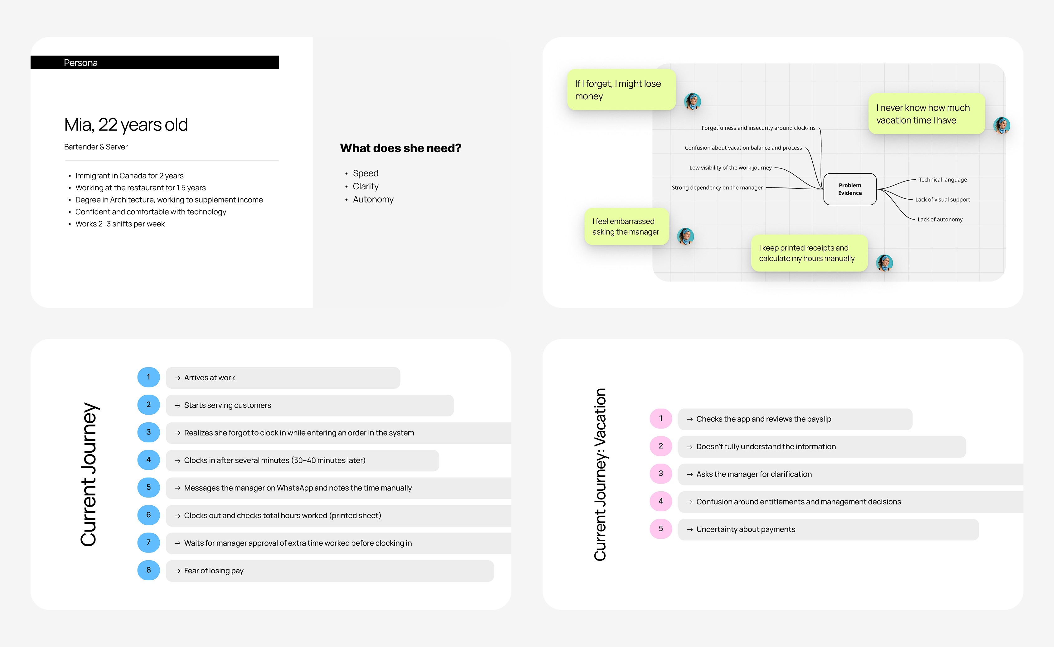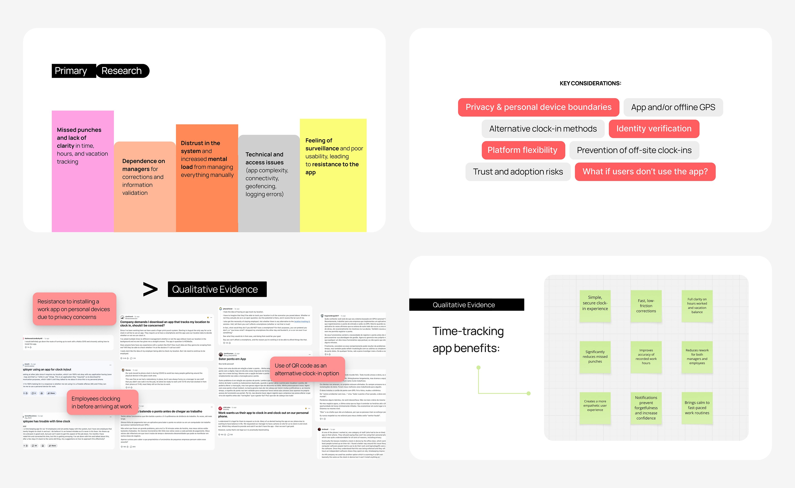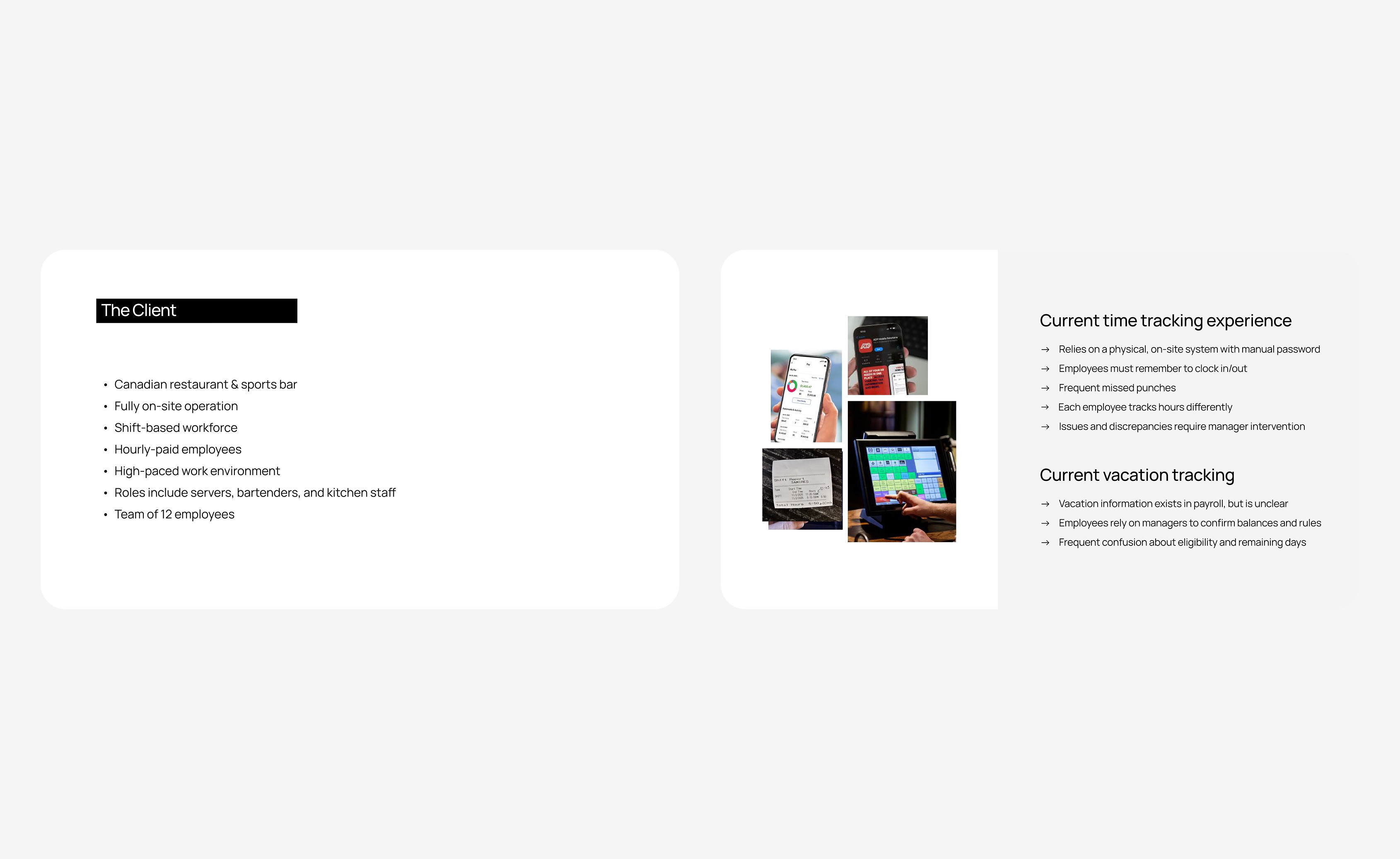 This case study explores early-stage UX research in the HR time-tracking space, focusing on understanding user pain points around clocking in, tracking hours, and vacation visibility, with an emphasis on clarity, trust, and usability.