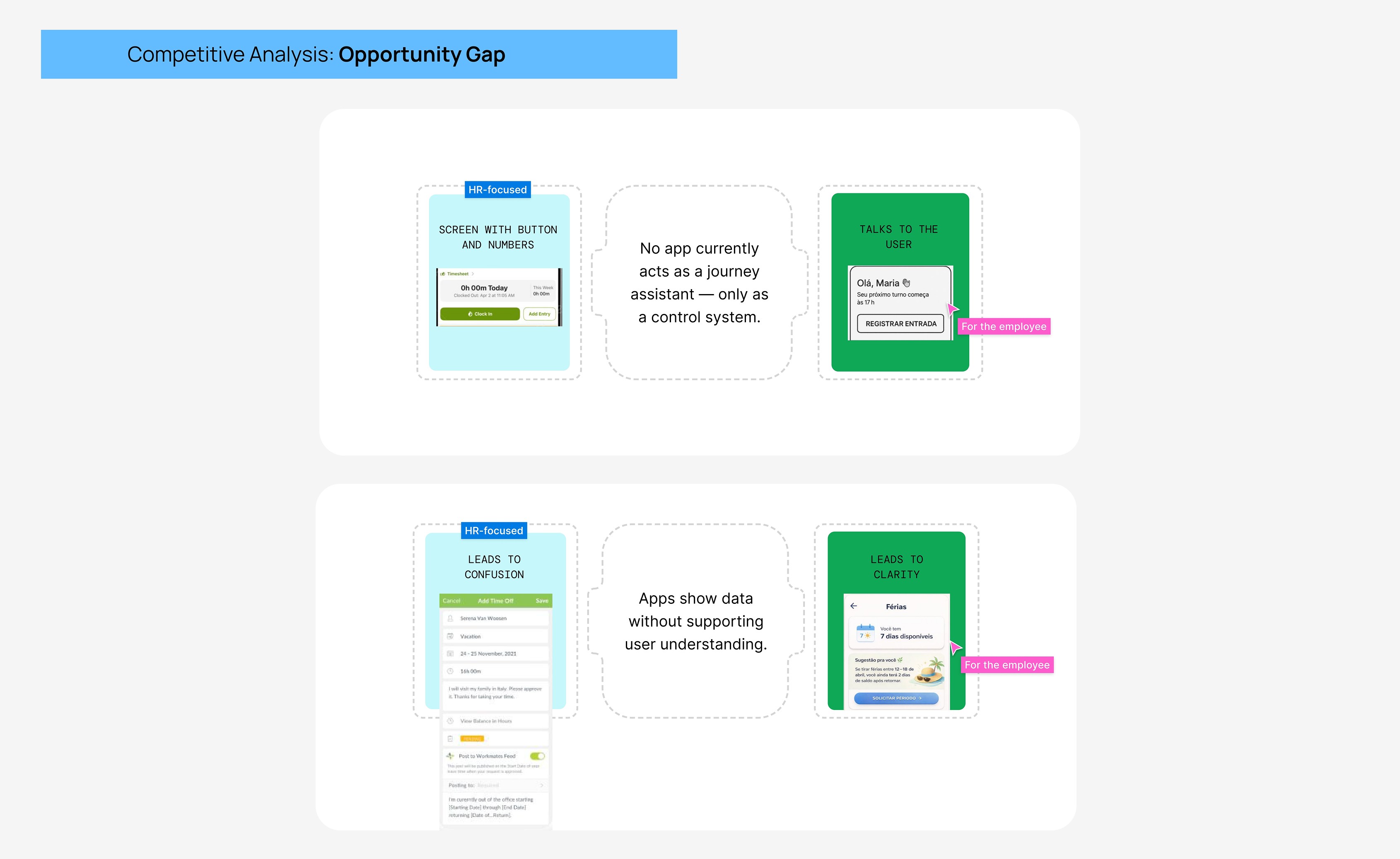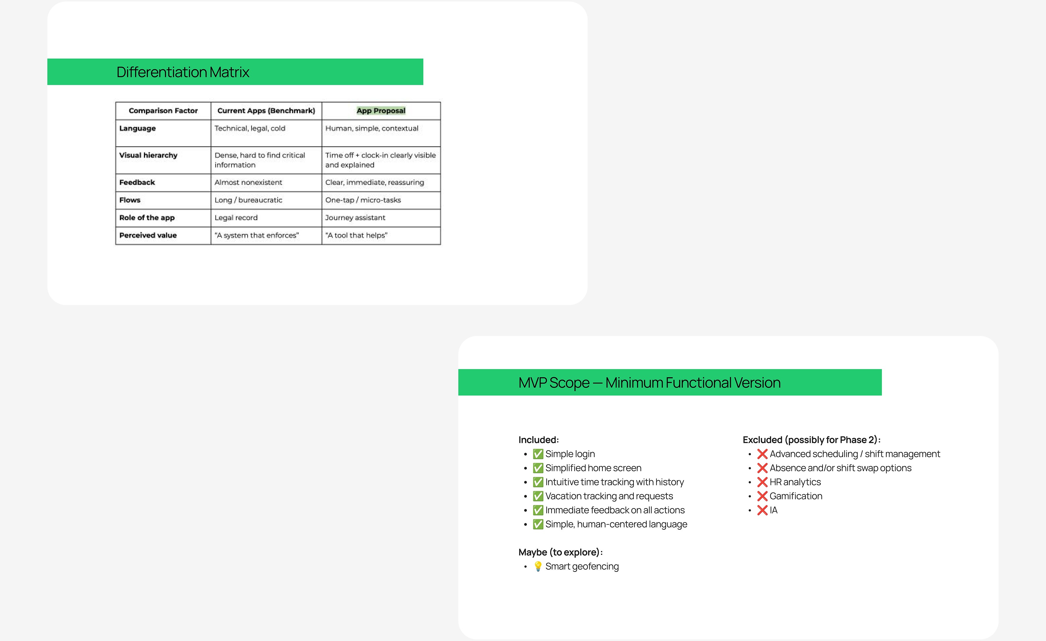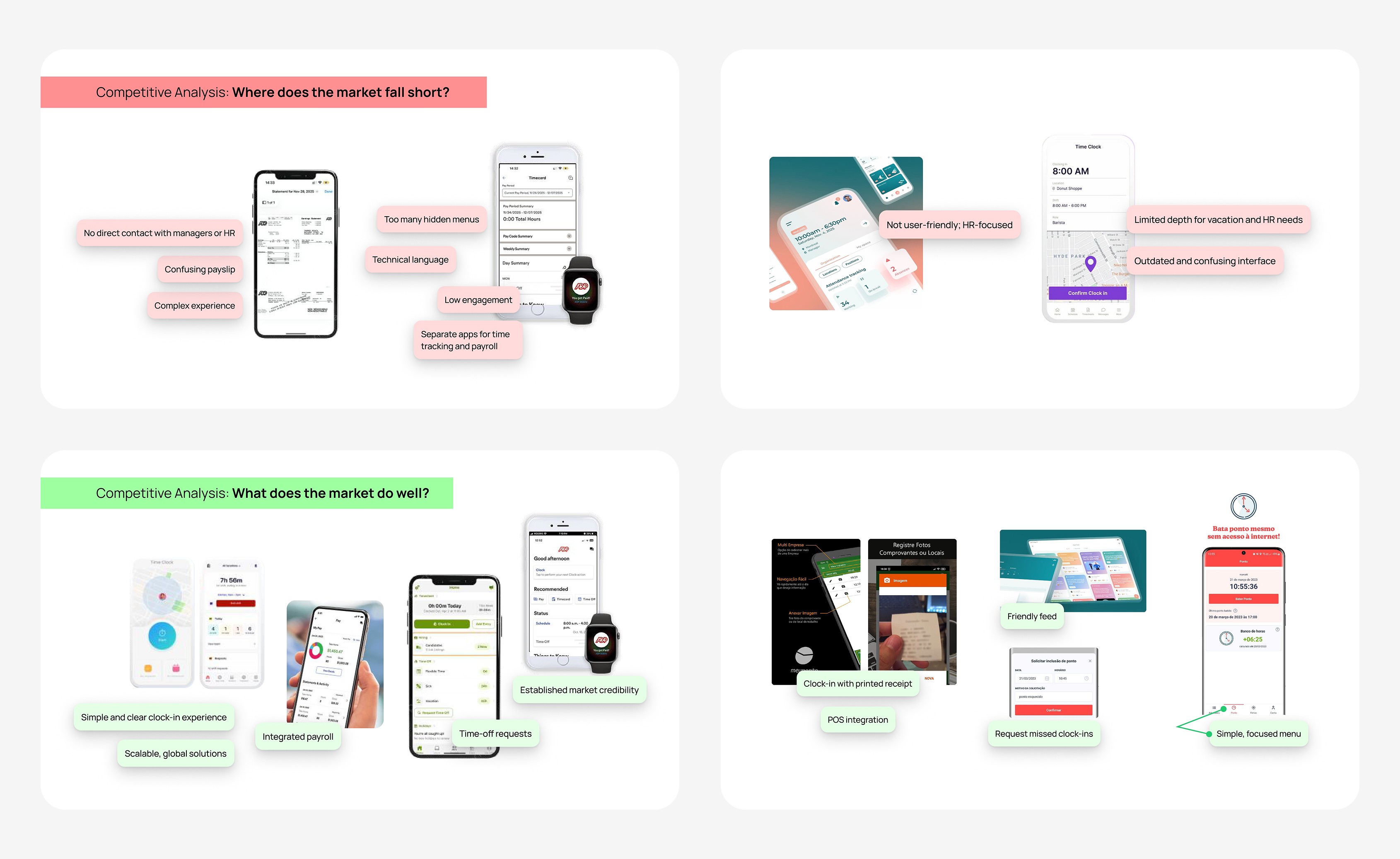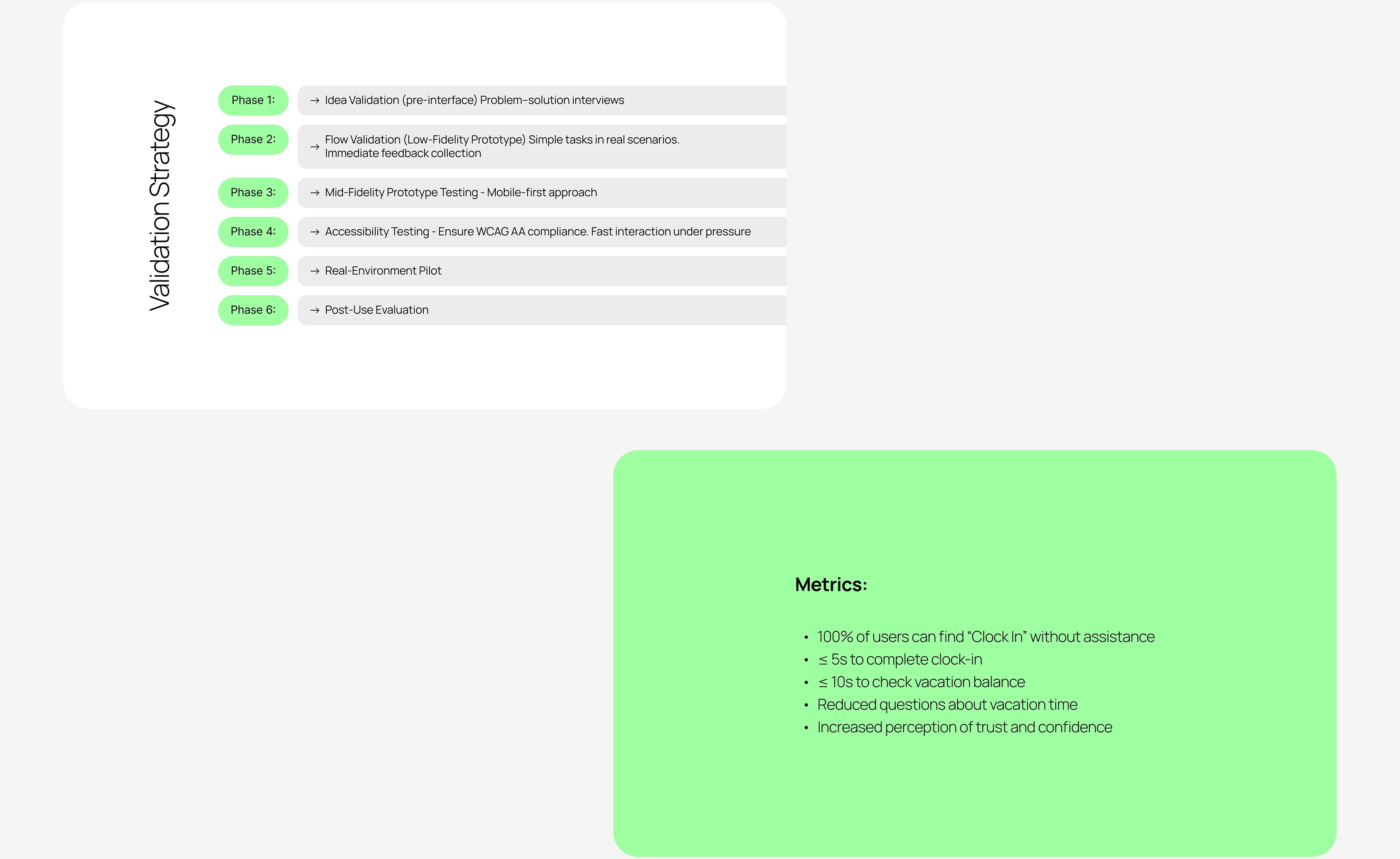This case study explores early-stage UX research in the HR time-tracking space, focusing on understanding user pain points around clocking in, tracking hours, and vacation visibility, with an emphasis on clarity, trust, and usability.
